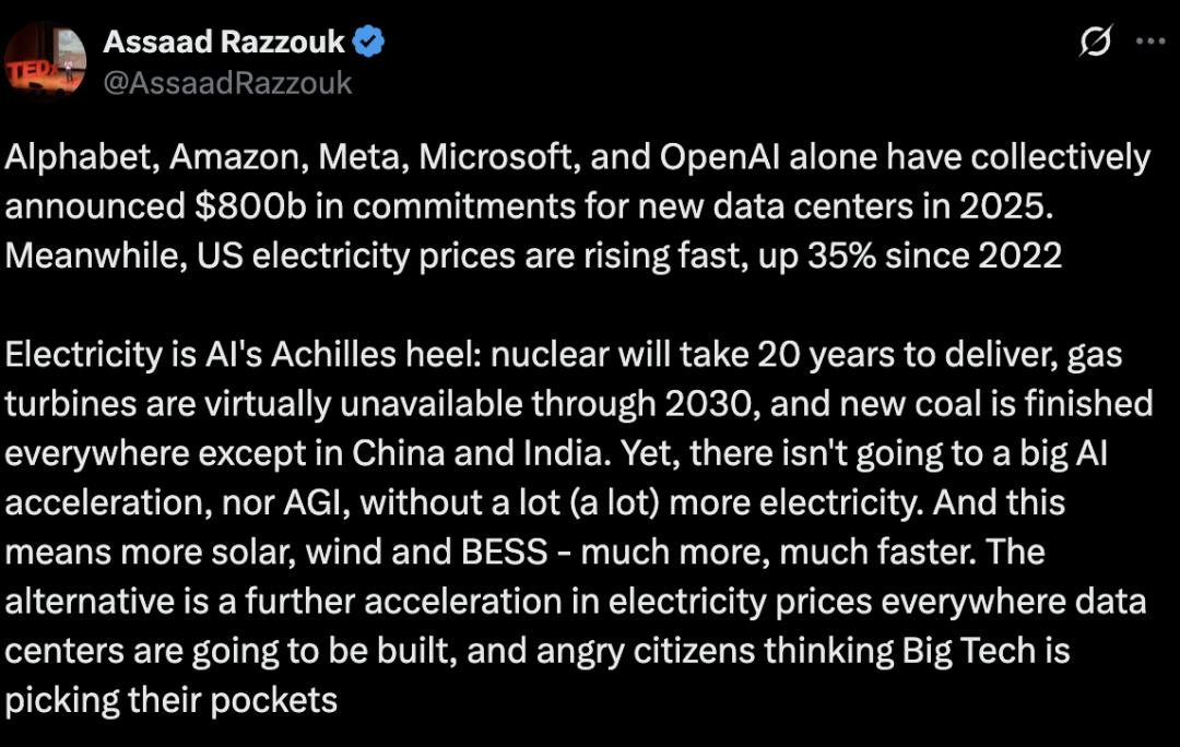 他还指出另一种更糟糕的情况:在数据中心即将建设的地区,电价将进一步加速上涨,愤怒的民众会认为科技巨头正在掏空他们的口袋。