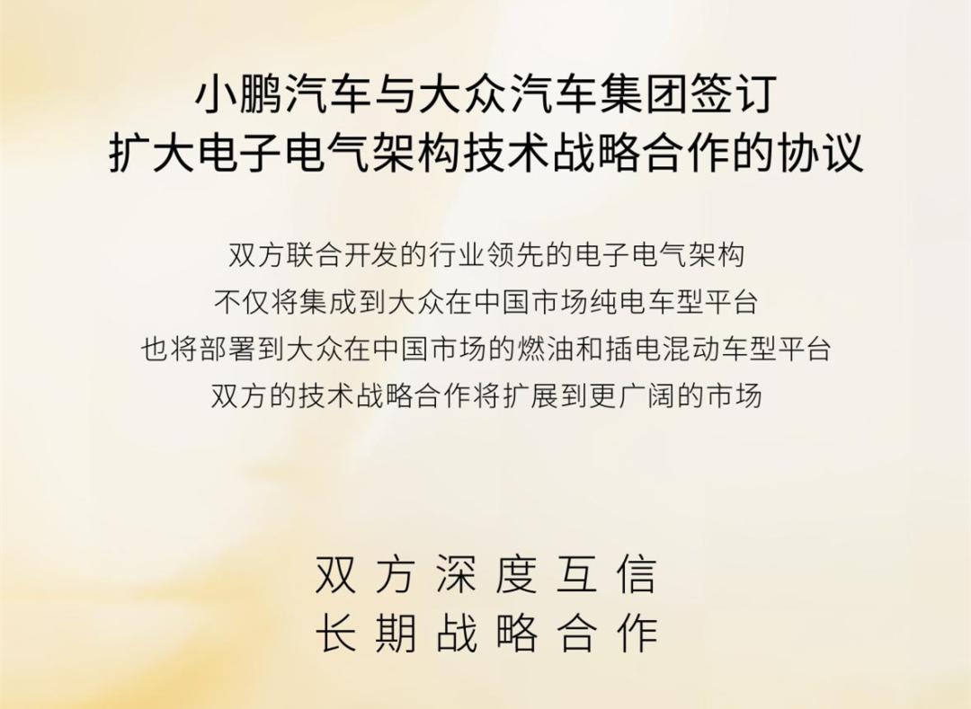 2025年8月15日,对大众来说是决定命运的一天。这一天,大众汽车集团和小鹏汽车宣布签署扩大电子电气架构技术战略合作协议,联合开发的先进电子电气架构应用范围将扩展至燃油车和插电混动车型平台。