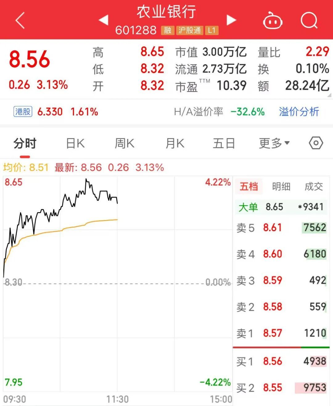今日上午,农业银行再度成为市场焦点。同花顺数据显示,该股涨幅达3.13%,盘中一度涨超4%,最新总市值达到3万亿元,位居A股首位,股价也创下历史新高。