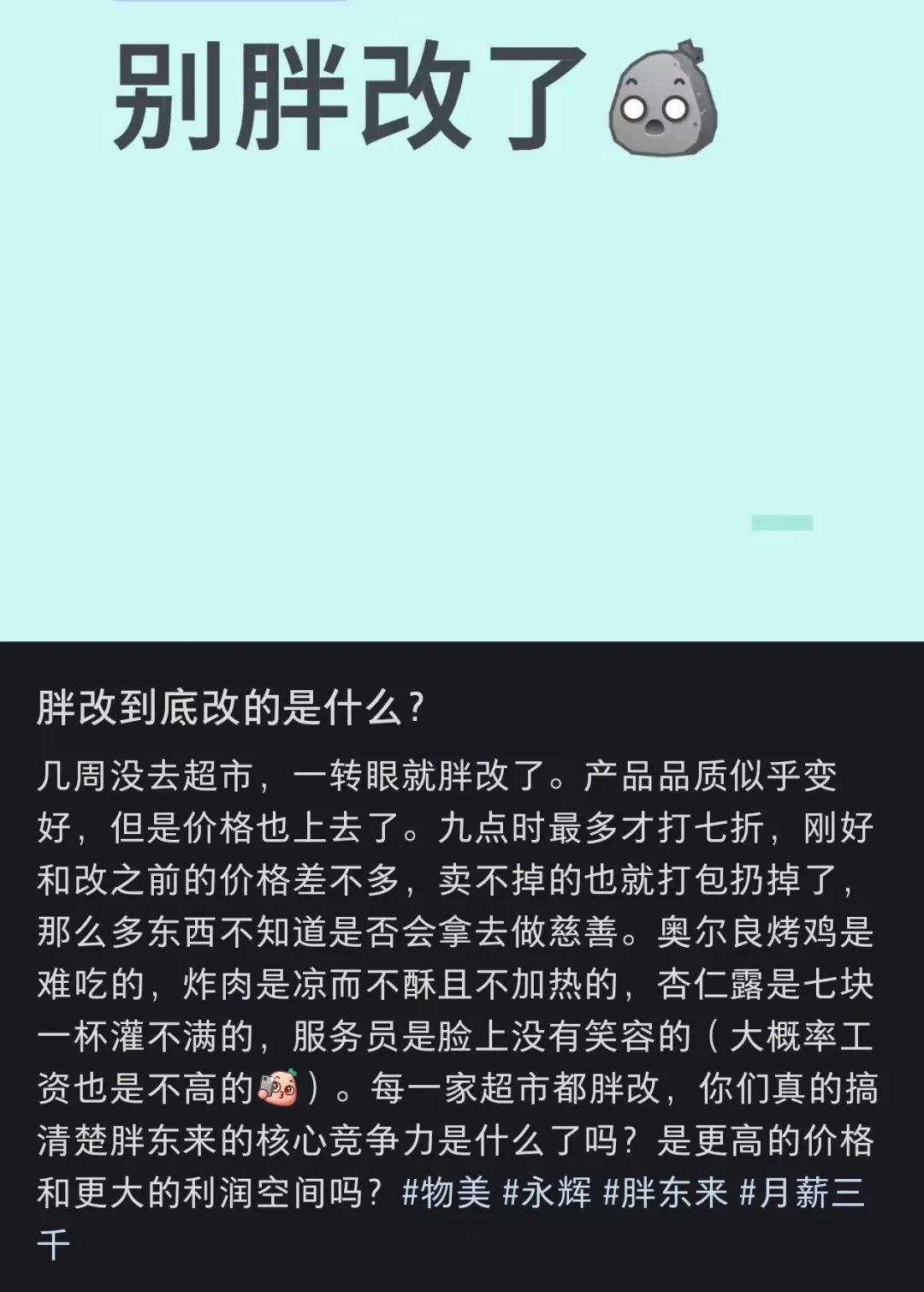 对于这条爆料贴,可能属于常见的劳资纠纷,不了解事件全貌不好轻易下结论。但进一步调查发现,“胖改”后的物美遭到大量吐槽。