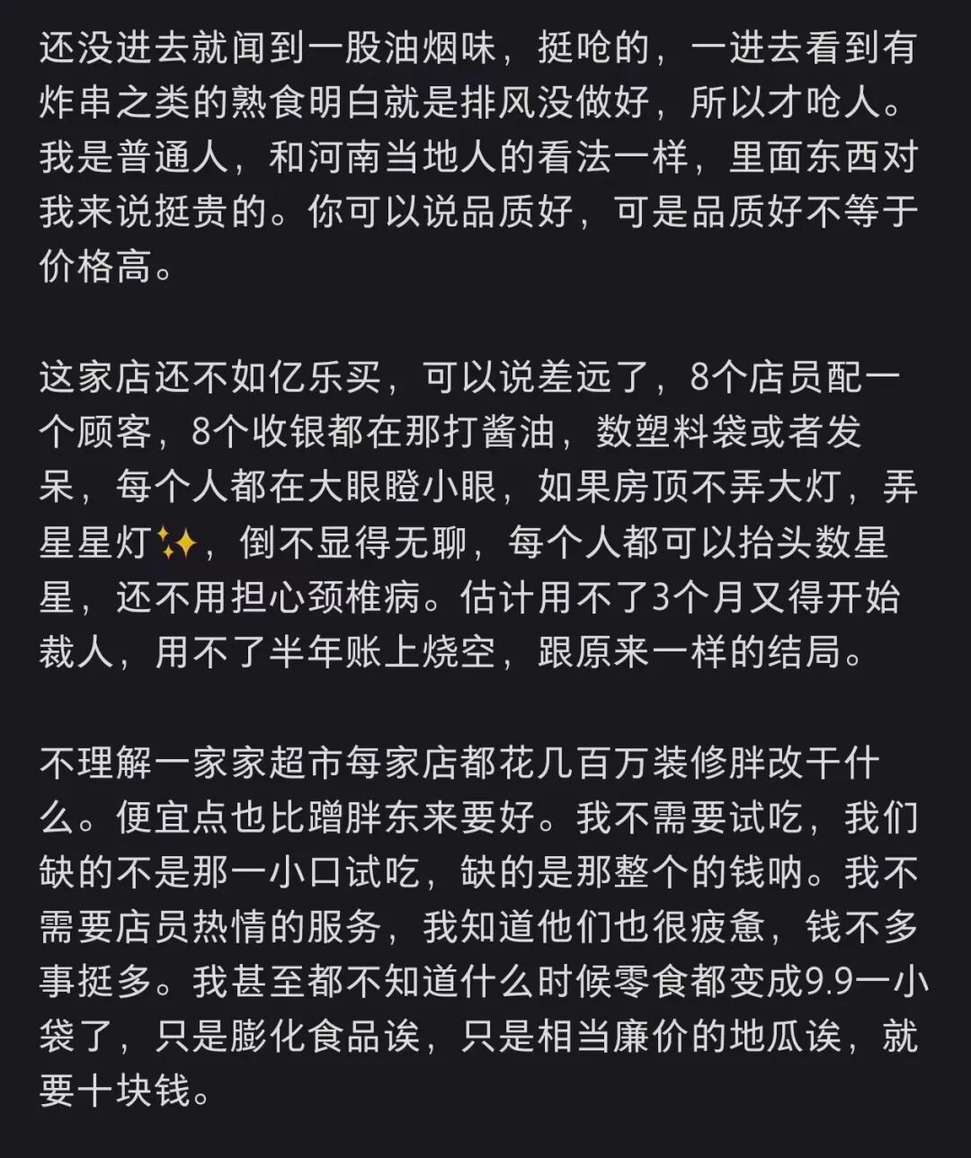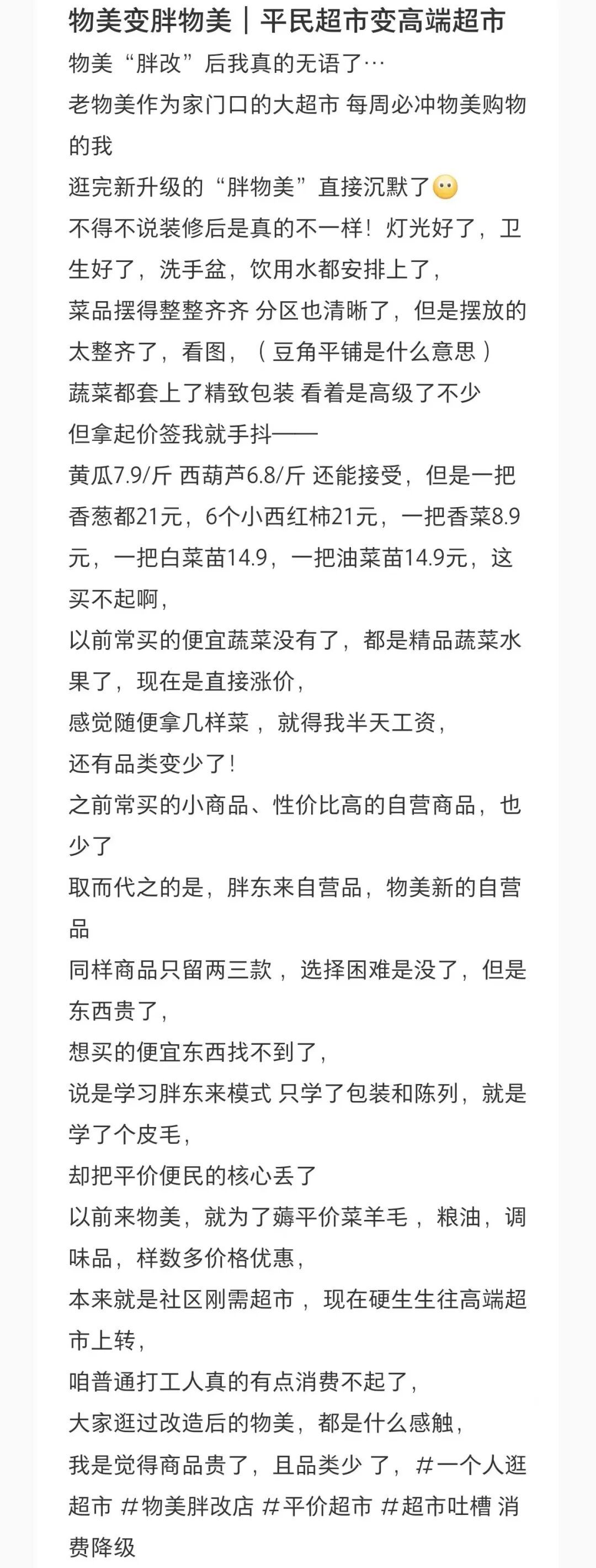 总体来看,大量网友觉得,物美在“胖改”时只学了表面的包装和陈列,却忽略了实惠价格和优质服务的核心竞争力。这种本末倒置的做法让大家对物美的“胖改”模式失望,认为其失去了原有的市场定位和竞争优势。