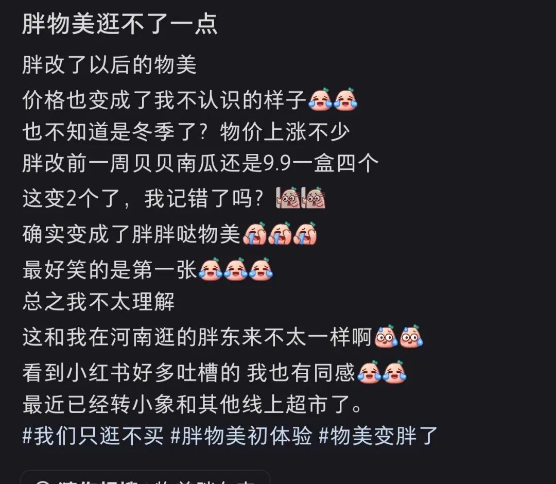 近期,很多网友在社交平台发帖吐槽,“胖改”后的物美特点突出,但价格贵了不少。