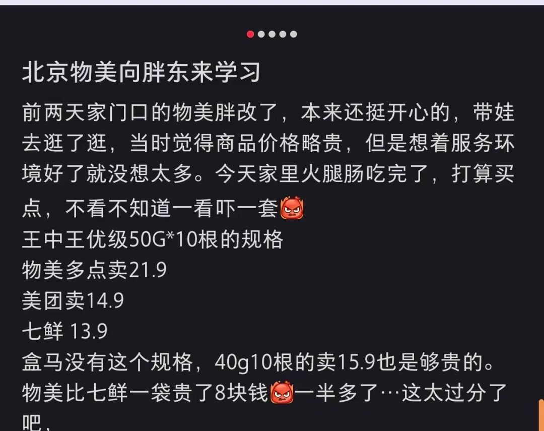 还有网友吐槽,物美“胖改”后,火腿肠在物美卖21.9元,而美团只要14.9元,七鲜13.9元,物美价格明显偏高。此外,部分网友称在“胖改”后的超市买食品后肠胃不适,对超市商品质量产生质疑。这种负面体验让消费者对物美的“胖改”模式失去信心。