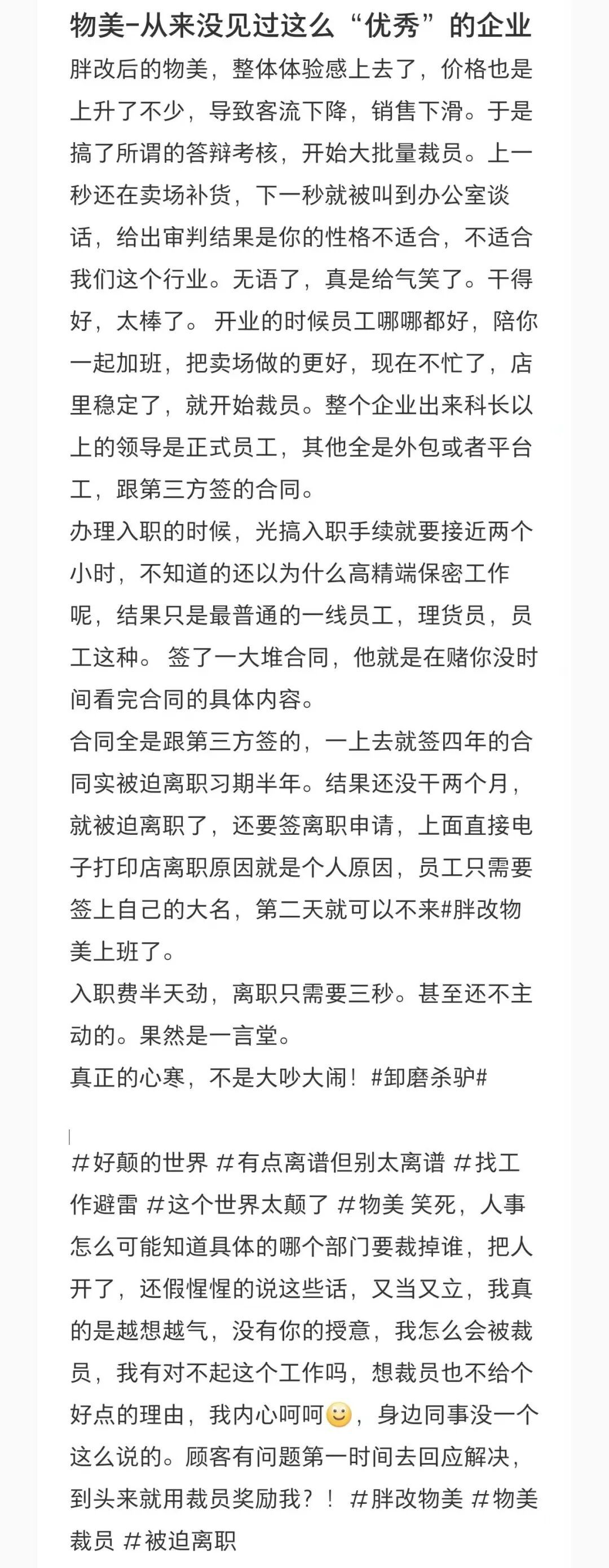 该网友表示,物美进行“胖改”(即胖东来调改)后,整体体验感有所提升,但价格也跟着上升,导致客流和销售下滑。为应对这一情况,物美开始实施答辩考核并大批量裁员。员工们在卖场辛苦工作,前一秒还在补货,后一秒就被喊到办公室,被告知性格不适合行业,被迫离职。