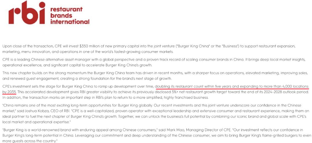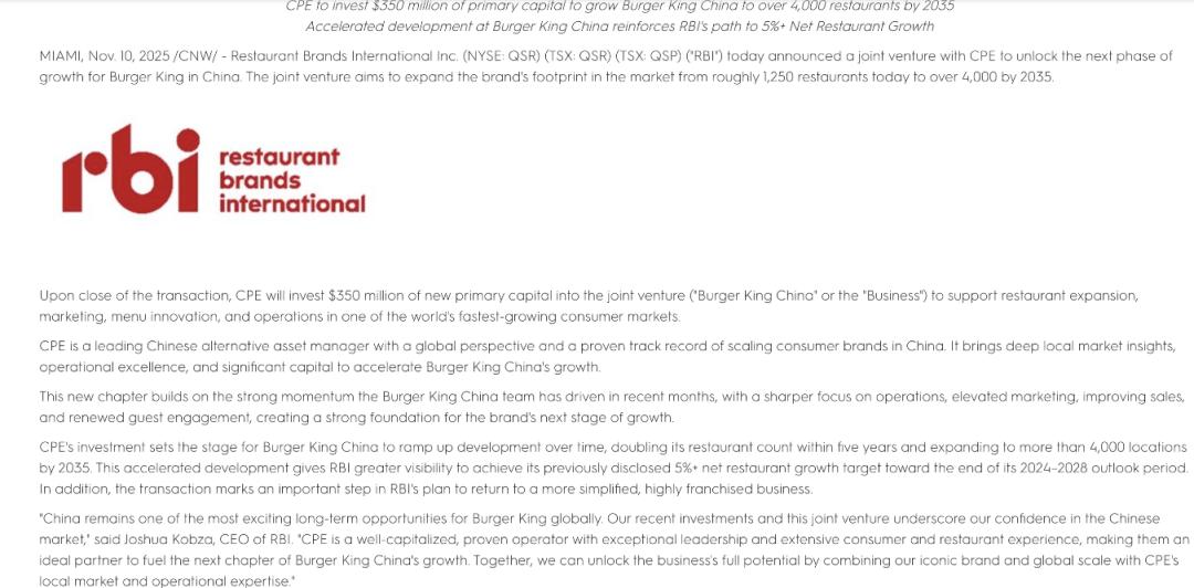 11月10日,RBI集团(汉堡王、Tim Hortons、Popeyes的母公司)与CPE源峰宣布成立汉堡王中国的合资公司。CPE源峰将持有约83%的股权,RBI仅保留17%,交易预计明年初完成。