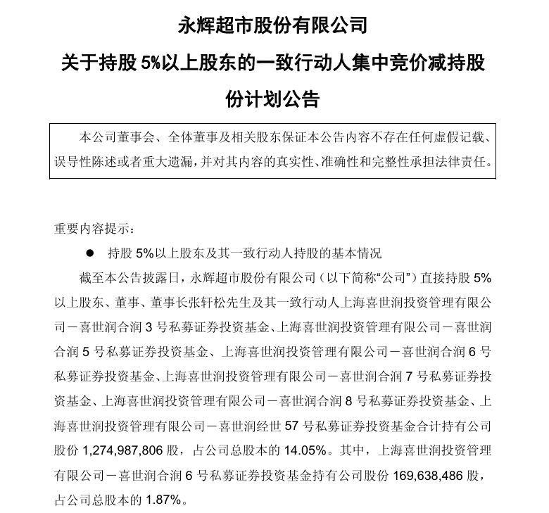 11月11日晚,永辉超市发布公告,称近日收到董事长张轩松及其一致行动人出具的《股份减持计划告知函》。因自身资金需求,他们拟通过集中竞价交易方式减持公司股份,合计不超过9075万股,也就是不超过公司总股本的1%。减持价格会根据市场情况来确定,减持时间为2025年12月4日至2026年3月3日。