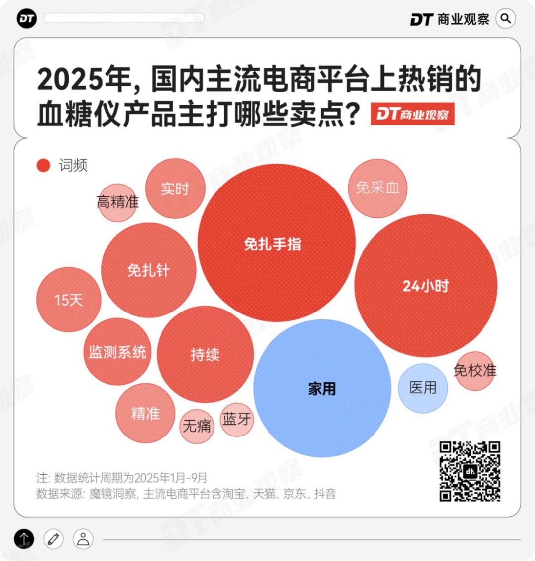 根据魔镜洞察的数据,2025年国内主流电商平台上,动态血糖仪的卖点集中在产品功能与适用场景,“免扎手指”“24小时持续监测”“实时”“精准”等关键词频繁出现。