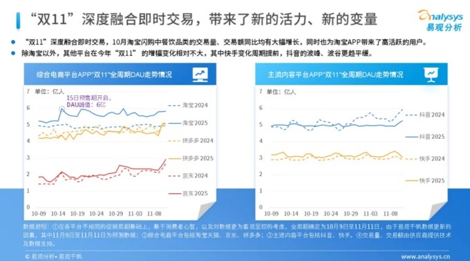 易观分析指出,今年双11展现出一些新特征。大促周期继续拉长,规则更趋简化,即时零售深度融入大促,特别是外卖等即时消费场景与电商深度融合,有效带动了今年“双11”周期的居民消费意愿,实现了双11平台增长和用户活跃双突破。10月15日天猫双11大促开始当日,DAU达6亿,创下历史纪录。