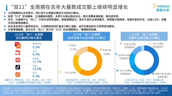 11月12日,易观分析发布《2025年“双11”大促全周期观察》。报告显示,在新消费场景和新技术带动下,2025年“双11”周期参与用户数显著提升,全国快递揽收量超206亿件,再创新高。包括淘宝天猫、京东、拼多多、抖音、快手在内的主要电商平台总成交额增长10%,淘宝天猫继续稳居市场份额第一,全网销量占比达50.1%。