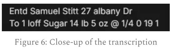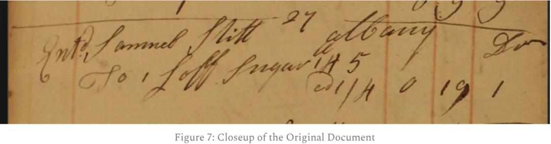 然而,谷歌新模型识别该日记账页面接近完美,数字全部正确,还纠正了格式小错误。如将店员记的“每个2/”转写为“@2/0”。此外,模型把“To 1 loff Sugar 145 @ 1/4 0 19 1”转写为“To 1 loff Sugar 14 lb 5 oz @ 1/4 0 19 1”。经考证,Gemini正确推断出1、4、5是重量单位数值,通过总价反推重量,在不同进制体系间换算。
