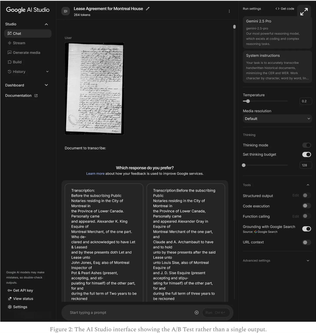 在相同数据集下,他们测试谷歌新模型,上传图片到AI Studio并输入固定提示词。Humphries挑选错误最多、最难辨认的文档,最终选了5份。