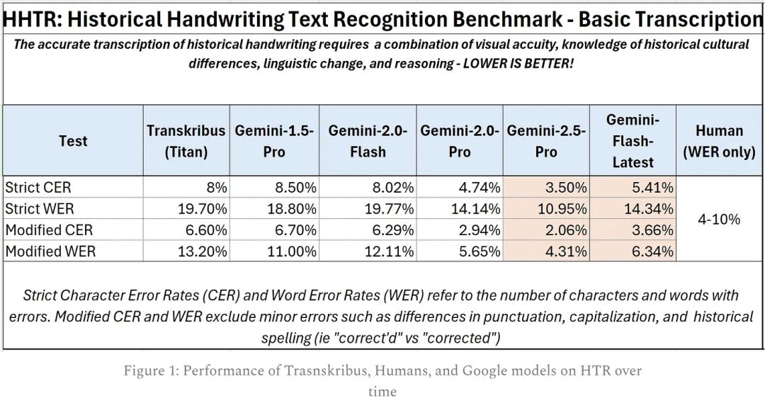 结果惊人,新模型转写的5份文档(超1000词)严格CER为1.7%,WER为6.5%,即约每50个字符错1个,且几乎所有错误在大小写和标点,“词”层面错误极少。排除这类错误后,CER降至0.56%,WER降至1.22%,表明该新Gemini模型在HTR上达人类专家级水准。