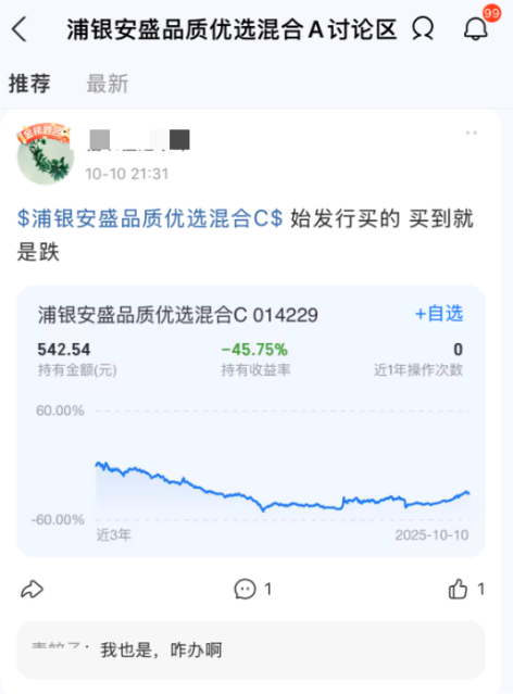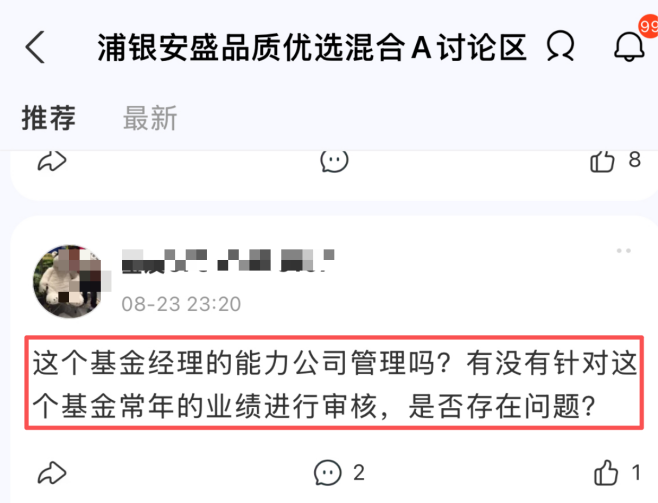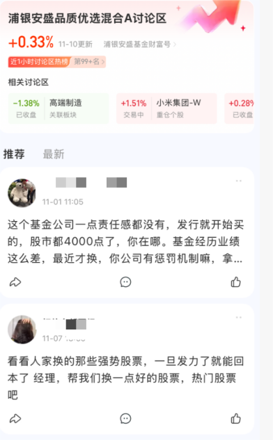 基民持有基金净值不断缩水,而基金公司收取高昂管理费,投资者信心受挫。在基金三方平台讨论区,持有人对蒋佳良抱怨不断,也有人质疑浦银安盛对基金经理巨亏业绩缺乏有效管理。