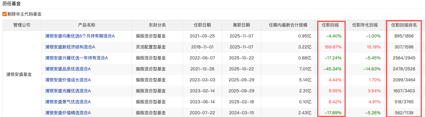 蒋佳良身为浦银安盛首席权益投资官,曾担任8只产品的基金经理,管理规模约占公司权益基金规模的五分之一。其任职期间业绩呈现明显两极分化,代表作浦银安盛新经济结构A于2018年成立,取得了169.87%的任职回报。但从2020年起,蒋佳良管理的基金产品表现不佳,多只产品业绩排名低于同类均线。其中规模最大的浦银安盛品质优选混合任职回报为 - 45.34%,净值接近腰斩,在2025年结构性牛市行情中,引发了持有者的质疑。