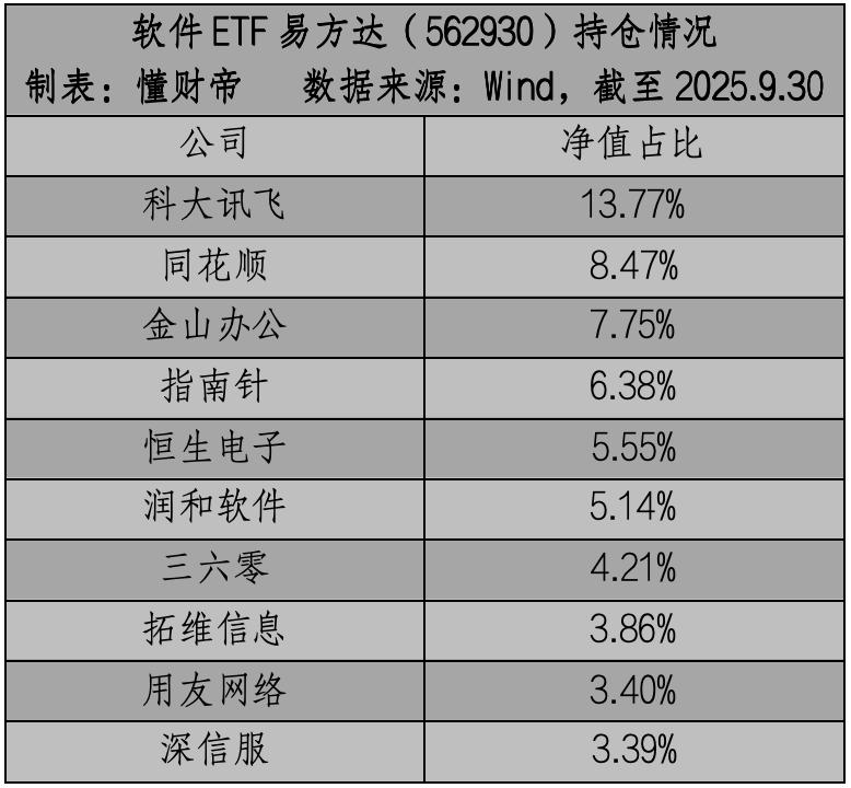 截至今年三季度末,软件ETF易方达(562930)前十大持仓包括科大讯飞、同花顺、金山办公、指南针、恒生电子、润和软件、三六零、拓维信息、用友网络、深信服。其中,科大讯飞是国内政务、教育、硬件等领域的AI先锋,2025Q3营收60.78亿元,同比增长10.02%,归母净利润1.72亿元,同比大幅增长202.4%。WPS母公司金山办公是国内AI办公软件的龙头,2025Q3业绩稳健增长,营收15.21亿元,同比增长25.33%,归母净利润4.31亿元,同比增长35.42%。深信服主营网络安全、云计算及IT基础设施,是国内AI+软件的领军者,今年第三季度,得益于AI业务持续突破,营收21.16亿元,同比增长9.86%,归母净利润1.47亿元,同比大幅增长1097.4%。