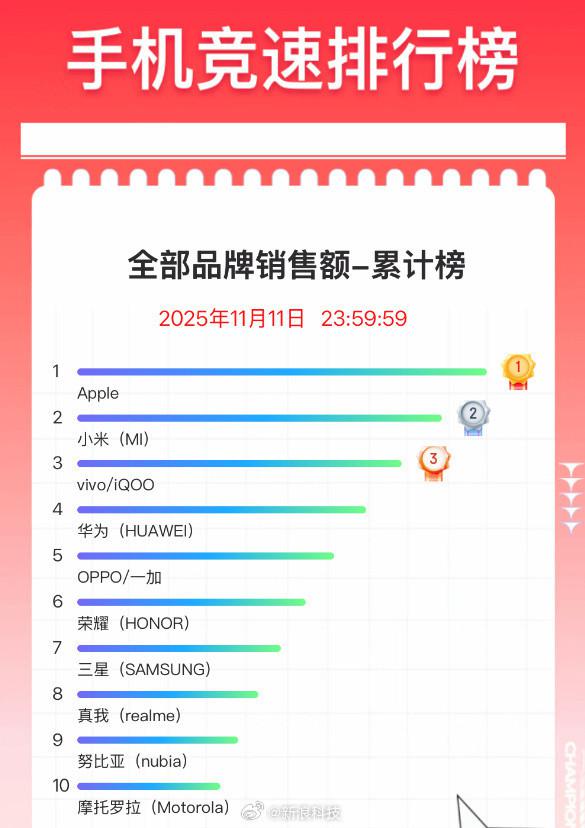 综合来看,今年双 11 手机市场的竞争格局未出现大幅波动,苹果凭借 iPhone 17 系列的强势表现继续领跑,而国产头部品牌则在销量与高端市场上双双发力,为年末收官战注入更多看点。