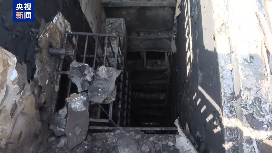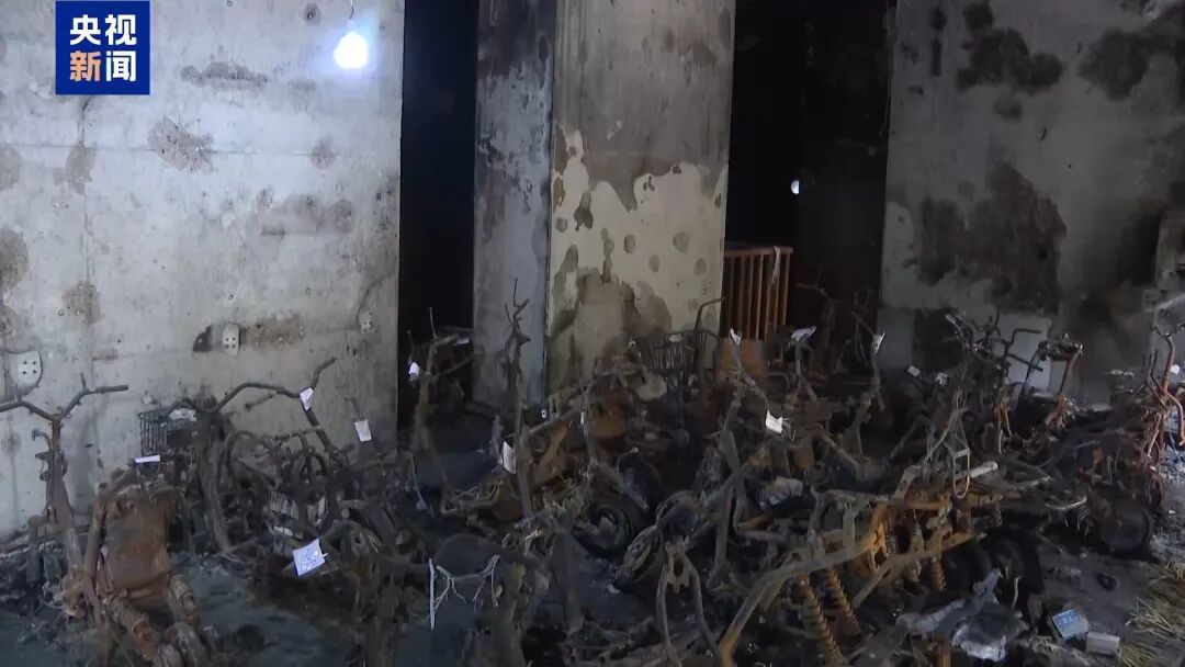 记者在事发现场看到,起火住宅楼多户居民外窗有烟熏痕迹,一层与门厅相连的架空层全部过火,多处墙皮脱落,架空层的电动自行车只剩车架和轮毂,采光通风天井也被烟熏火燎。
