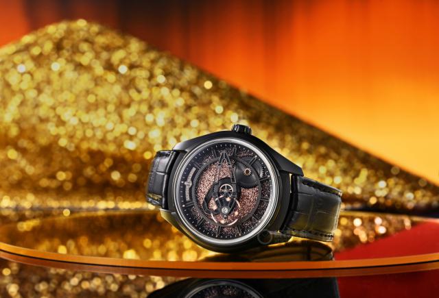 目前全瑞士仅有一家实验室能完成这种钌晶体结晶工艺,近两年也有其他腕表品牌采用。但为了凸显自身特色,雅典特意为钌晶体表盘做了物理气相沉积(PVD)镀层处理来赋予色彩。表盘不仅带有温暖耀眼的玫瑰金色,还通过手工涂覆黑漆晕染出微妙的阴影层次,既细腻华美,又使盘面的视觉层次更加丰富。
