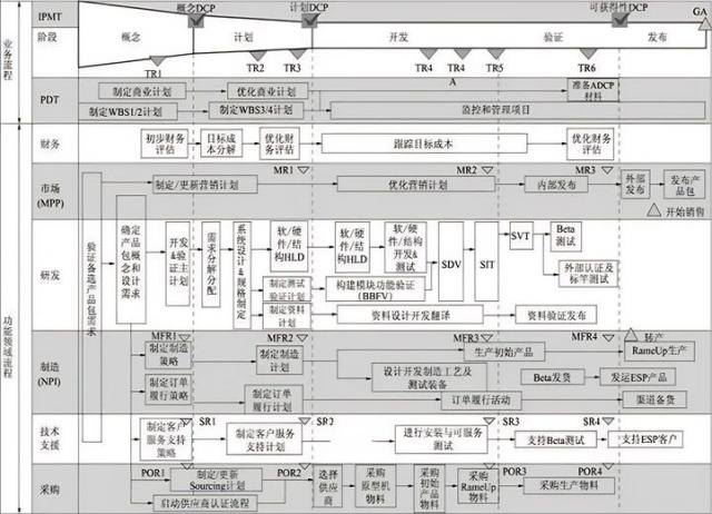 图2的袖珍卡一页纸概述了IPD流程关键信息,方便PDT成员了解主要工作及依赖关系,加上时间信息后可用于管理开发工作。从纵向看,IPD流程分为业务流程和功能领域流程两部分。业务流程包括PDT团队管理商业计划、项目计划及IPMT商业决策等活动;功能领域流程描述各功能领域参与情况、主要活动、关键交付和质量控制点。这是通用流程结构,各项目可保持一致并裁剪,每个功能领域工作需细化,与PDT团队结构匹配,华为称其为功能领域支撑流程。从横向看,各产品开发阶段目标明确:概念阶段确定产品需求和备选概念,形成初步计划;计划阶段定义产品方案和竞争优势,制定详细计划;开发阶段开发和验证产品并完成制造准备;验证阶段进行批量和客户验证测试;发布阶段发布产品并准备销售发货;生命周期阶段监控产品市场表现,适时退出市场。