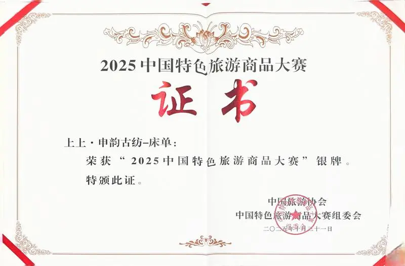 在刚结束的2025中国特色旅游商品大赛上,淮海集团旗下的中华老字号“上上”,凭借其蕴含非遗匠心的“申韵古纺床单”,从全国三万多件参赛商品中脱颖而出,荣获中国特色旅游商品大赛银奖。中国特色旅游商品大赛是在中国旅游协会主办,国家文化和旅游部指导下开展的一项全国性、高规格旅游商品赛事。
