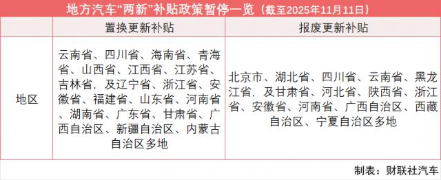 财联社 11 月 12 日讯(记者 张屹鹏)在“金九银十”结束后,汽车以旧换新、报废更新的“地补”政策迎来了新一轮暂停。据财联社记者不完全统计,截至目前,九成的省、直辖市、自治区已暂停汽车置换补贴或报废更新补贴。此外,上海等地通过“摇号”方式开展汽车报废更新和置换更新补贴活动。