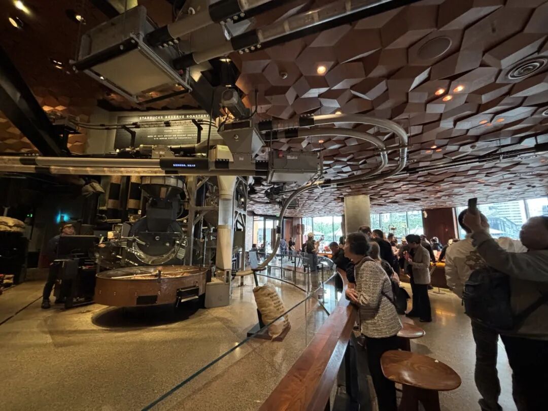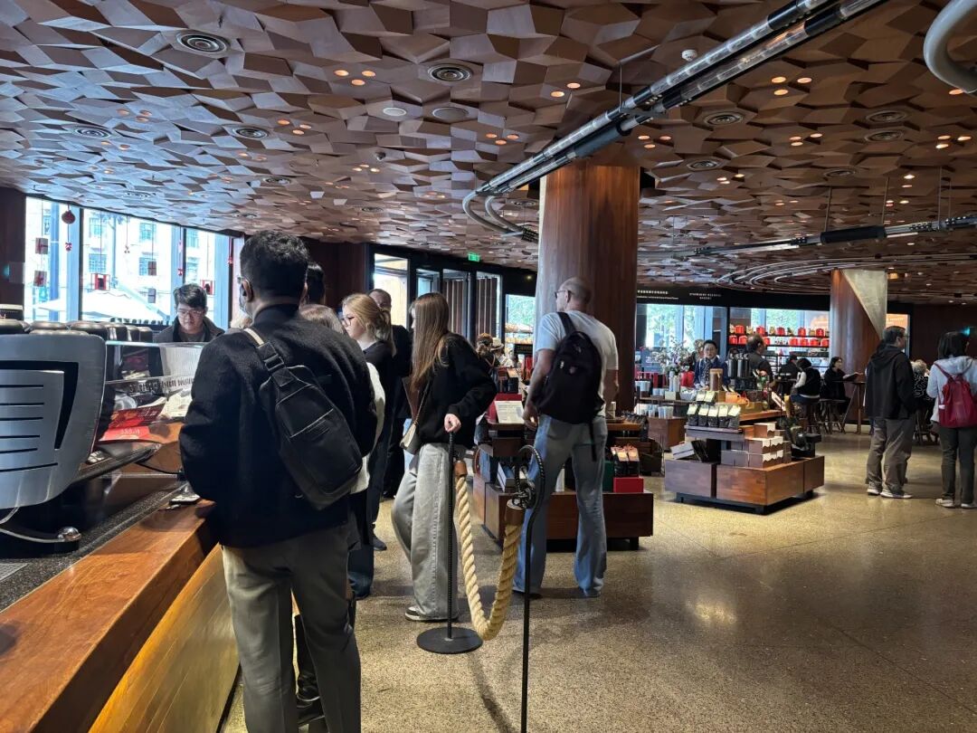 工作日上午10时,上海最大的星巴克工坊内,烘焙咖啡豆的香气裹挟着人声弥漫开来。游客举着马克杯在巨型烘豆机前拍照,商务人士对着电脑敲键盘,收银台前的消费者络绎不绝。