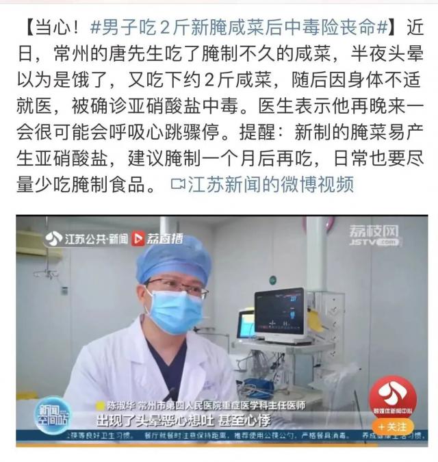 然而,腌菜虽美味,却也可能暗藏风险。此前有新闻报道,常州的唐先生是腌菜的忠实爱好者,菜刚腌了几天,他就忍不住吃了两斤。结果不久后,唐先生出现口唇发紫、恶心呕吐、冒冷汗等症状,被紧急送往医院抢救,最终确诊为急性亚硝酸盐中毒。
