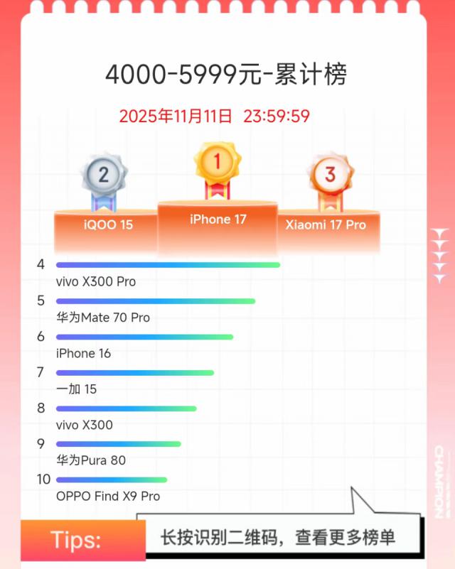 不过,小米在高端阵营有好消息。在6000元以上榜单中,小米17 Pro Max排名第四,比iPhone 16 Pro Max还高一位。在4000 - 5999元榜单里,小米17 Pro排到第三。特别是17 Pro Max,在6000元以上的安卓市场拿下全平台销量和销售额冠军,这在以前很难想象。不过,标准版的小米17和K90系列表现平平,K90能在2000 - 2999价位排第三,小米17则几乎没存在感,说不定明年618才是它们的主场。