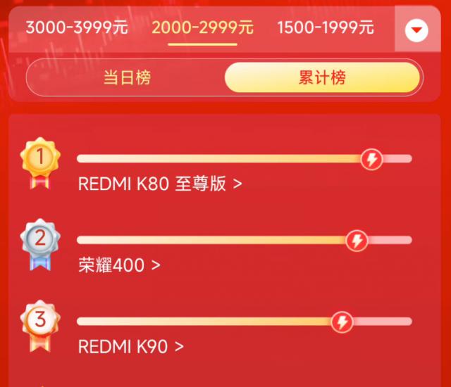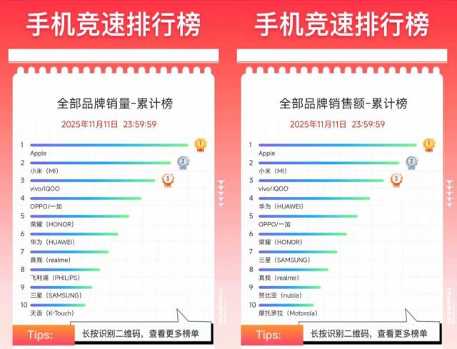 国产阵营里,继苹果之后,卖得最好的是小米。曾在618拿下安卓冠军的REDMI K80,这次继续夺冠,总排名仅次于苹果的iPhone 17系列。此外,REDMI Turbo4 Pro和K80至尊版也分别排到第六和第九名。这三款机型能进销量前十,完全是靠价格优势。它们的最低价分别低至1500+、1600+和1100+。尤其是K80至尊版,堪称双11性价比最高的手机之一,最终只排第9,有点意外。