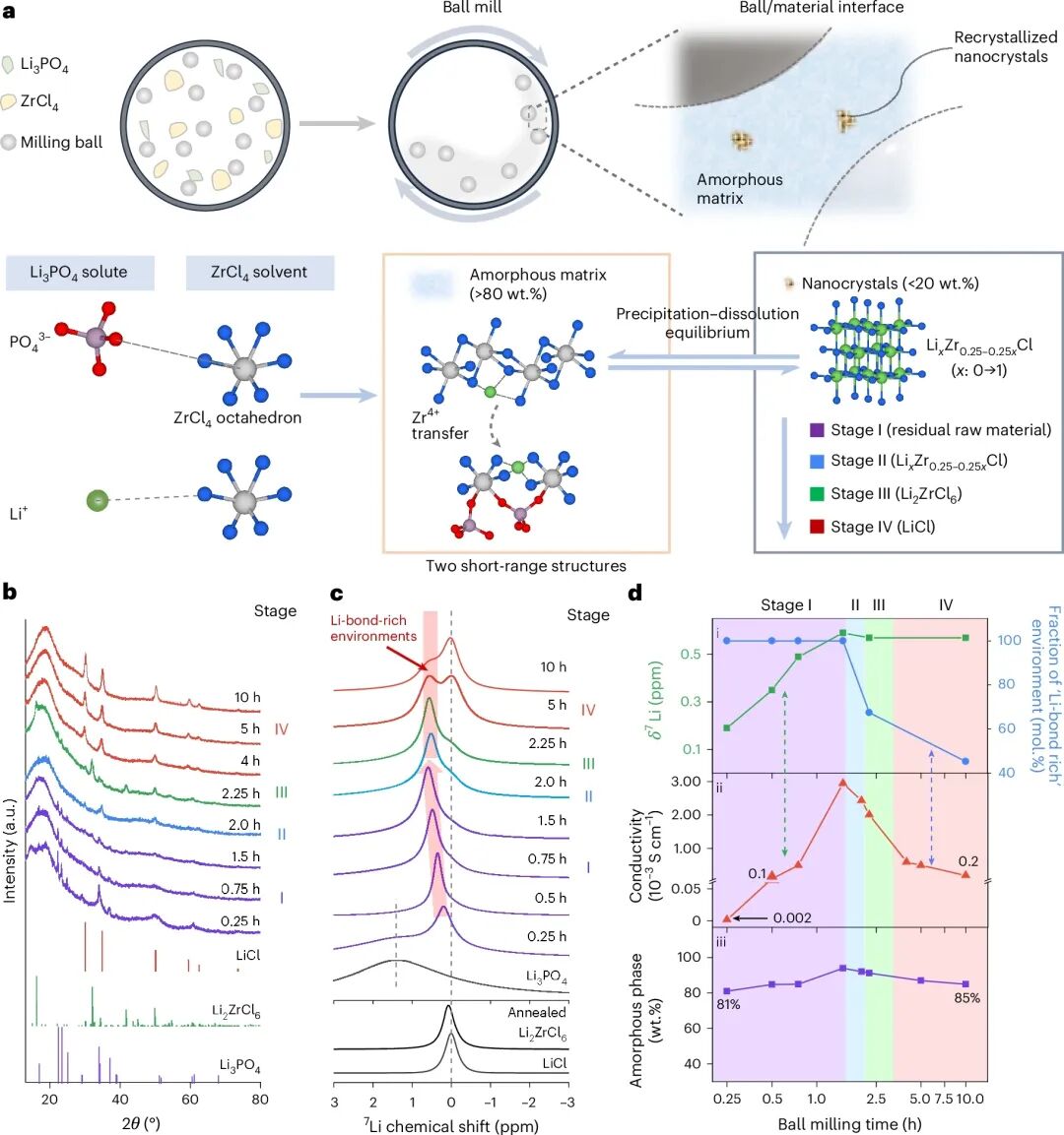 2. 以2/3Li3PO4–ZrCl4为例,通过结合实验室X射线衍射和同步辐射X射线衍射追踪其相演化过程(图5b)。根据依次出现的晶相(Li3PO4、LixZr0.25−0.25xCl(0<0.33)、Li2ZrCl6和LiCl),可观察到四个演化阶段。纳米晶相的转变揭示两个重要事实:第一,非晶基体中存在(至少)两种局域结构——一种由Li+、Zr4+和Cl−离子组成(对应观测到的晶相),另一种应包含溶质盐的阴离子PO43−;第二,随着依次出现的晶相中Zr含量递减,证明Zr4+离子从前一种结构向后一种结构迁移,这可由溶质/溶剂(PO43−/Zr4+)强相互作用及后续讨论的原子环境演化来解释。