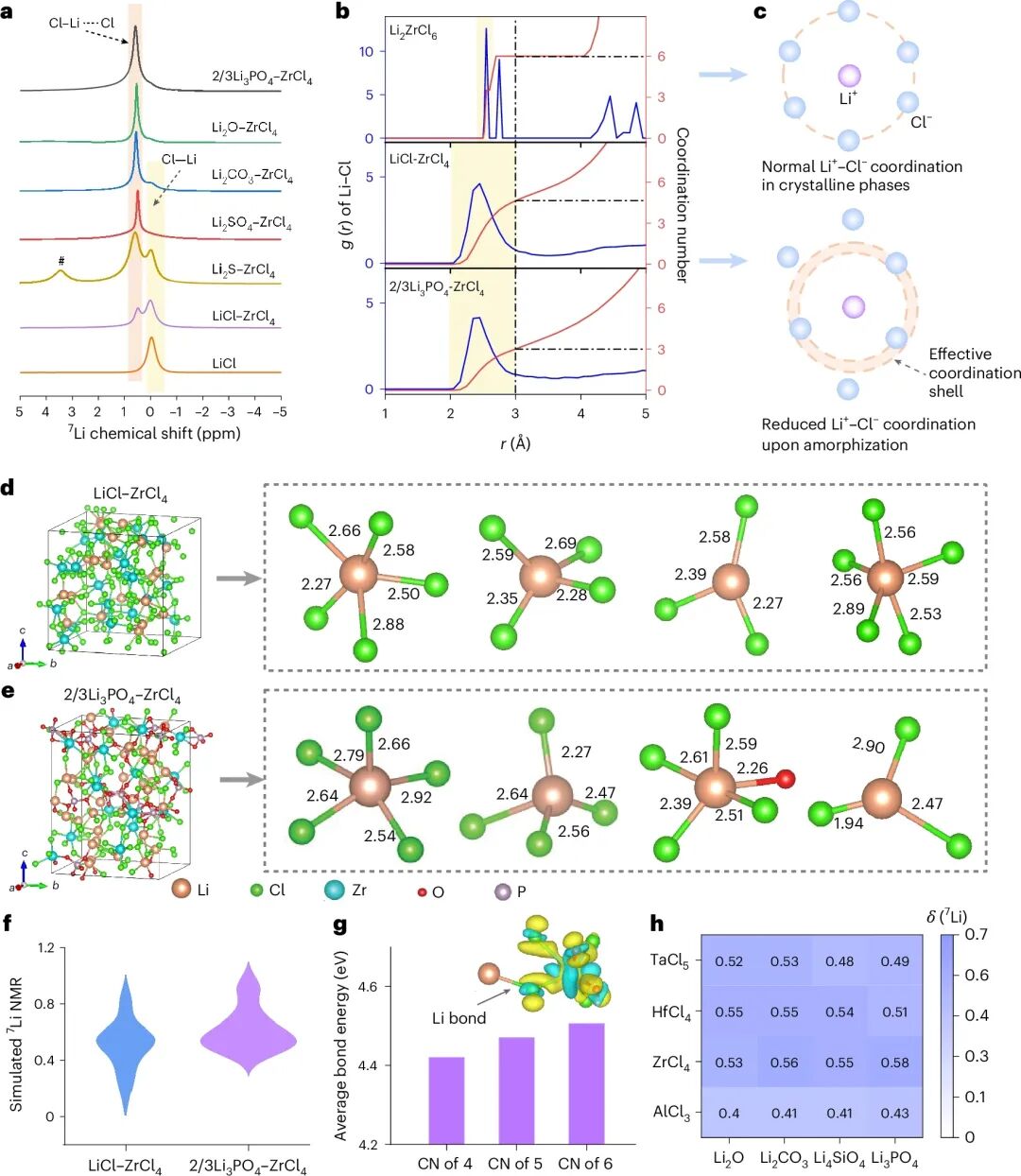 3. 在模拟的非晶结构中,锂原子均匀分布在锆中心多面体(LiCl–ZrCl4中的[ZrCln]和2/3Li3PO4–ZrCl4中的[ZrOmCln])附近,形成多种配位数降低的扭曲[LiClx](x = 3–5)构型;在2/3Li3PO4–ZrCl4中还观察到少量[LiClxOy](x = 1–3,y = 1–2)团簇,但其含量极微且不占主导(图4d,e)。基于模拟结构计算的7Li核磁共振化学位移与实验值高度吻合(图4f)。这两个材料中~0.5ppm的锂配位环境正是由这些低配位数的扭曲[LiClx]构型组成。这些局部构型形成时,裸露的锂核被邻近与锆原子共价键合的氯原子孤对电子静电吸引。这种锂 - 氯相互作用特征表现为较低配位数和减弱键能(图4g)。有研究将这种作用视为不饱和键,即类氢键的“锂键”。因此,固态解离电解质中~0.5ppm的锂配位环境也被称为“富锂键环境”。