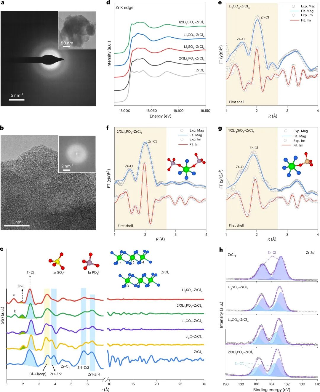 1. 7Li固态核磁共振谱显示,除锆配位环境外,固态解离电解质中形成了相似的锂配位环境。六种初始锂盐的核磁共振峰分别位于不同化学位移处,表明每种材料中独特的锂配位环境。但与ZrCl4解离后,这些环境趋于统一,在约0.5ppm处产生新共振峰(图4a)。该信号对盐阴离子(O2−、S2−、CO32−、SO42−和PO43−)依赖性较弱,且在仅含Cl−阴离子的LiCl–ZrCl4体系中同样存在,表明固态解离溶剂中的Cl−主导了局部锂配位环境。此外,相对于LiCl中[LiCl6]对应的0ppm峰,该信号向低场位移暗示该环境中锂的配位数降低。