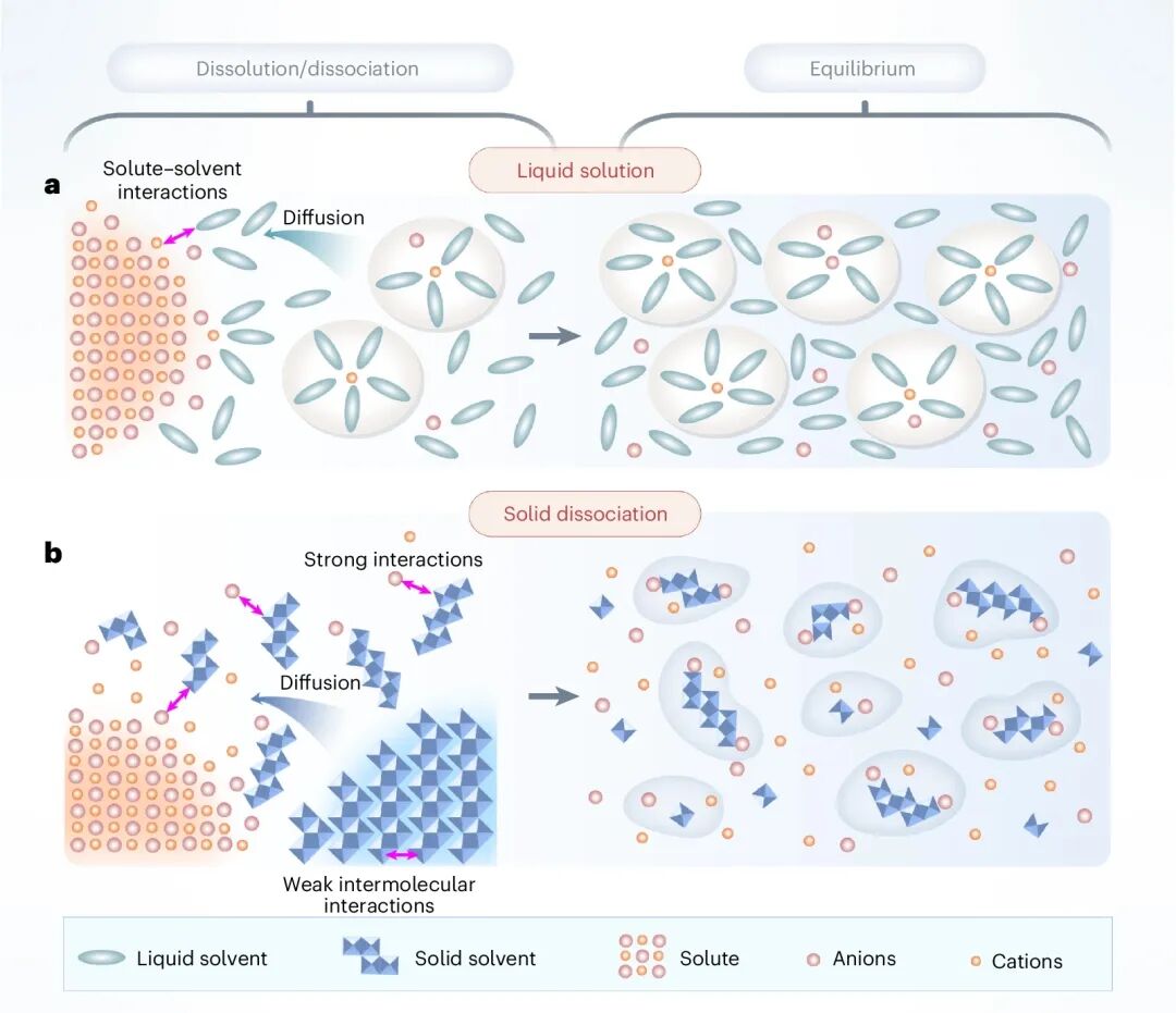 1. 固态解离的概念源于盐类在液态溶剂中的溶解过程。微观上,溶质 - 溶剂界面处的溶剂分子与表面离子发生配位,削弱离子晶格作用,形成易于脱离界面的溶剂化结构(图1a)。该过程对溶剂有结构要求:(1)具有动态灵活的局域环境,可实现溶剂化层的持续重构;(2)存在弱分子间相互作用以降低离子扩散能垒;(3)具备可接触的配位点,能与盐的阳离子和/或阴离子产生强相互作用。传统刚性晶格离子固体缺乏这些特性。基于此,研究重点转向寻找能模拟液态溶剂结构与相互作用特征的固体材料,以实现固态下的盐类解离(图1b)。