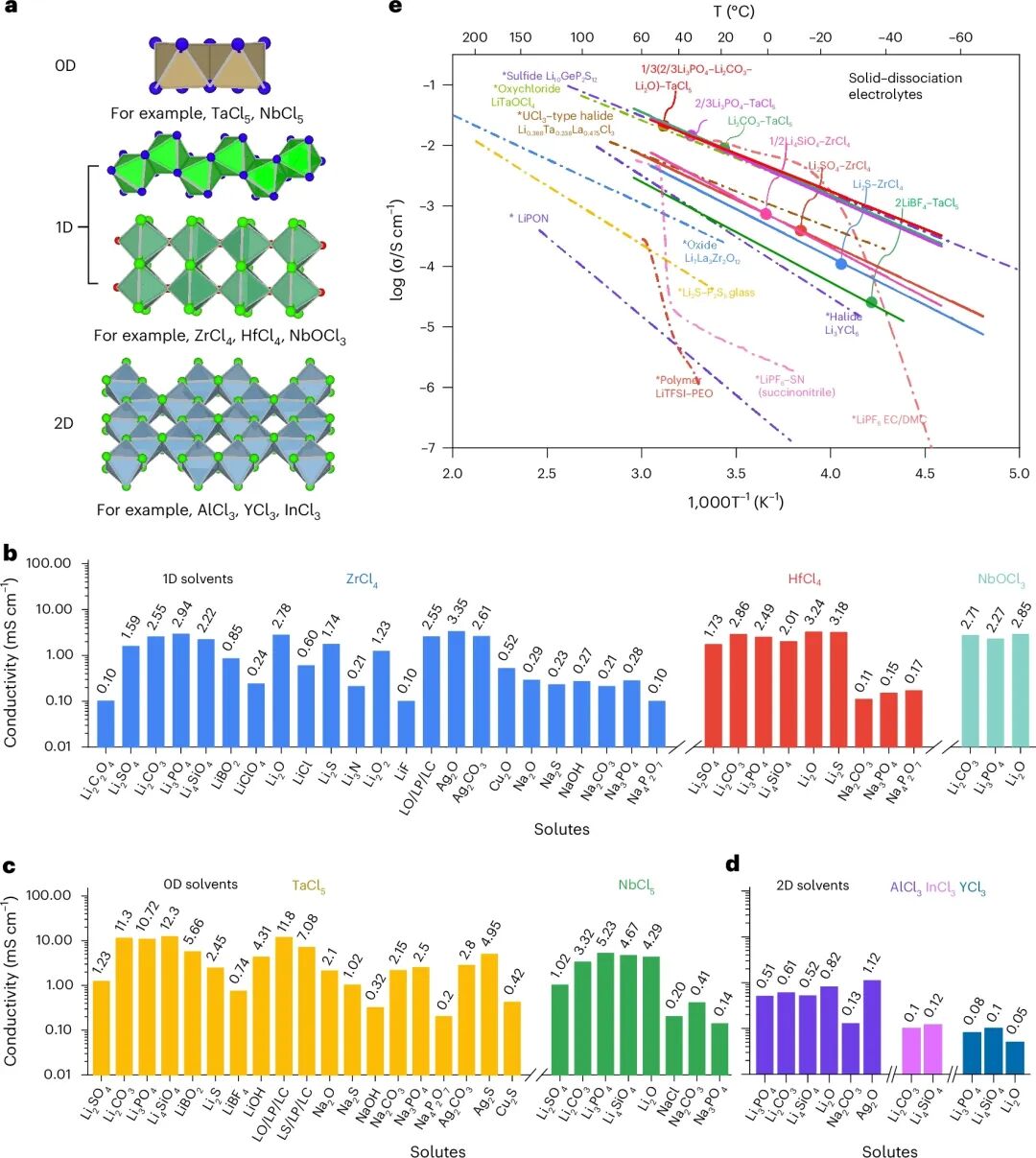本研究提出了固态解离策略,利用卤化物范德华材料作为固态溶剂溶解盐类,形成非晶态离子导电固体。通过该方法,发现了73种新材料,其中40种材料的离子电导率超过10−3Scm−1,可传导Li+、Na+、Ag+和Cu+。研究分析了溶剂与盐之间的原子尺度相互作用,揭示了实现固态解离的动态结构重排机制。在不同溶剂 - 盐组合中观察到一致的离子环境,揭示了该体系中离子传输的普适性机制。和液态电解质的成分调控类似,固态解离技术可针对特定应用条件进行固态电解质的定向设计。目前已开发出适用于快充电池、低温电池和4.8V高压电池的原型电解质,展现出优异的干燥环境稳定性和成本优势。固态解离策略为发展新一代固态电解质提供了多功能平台。