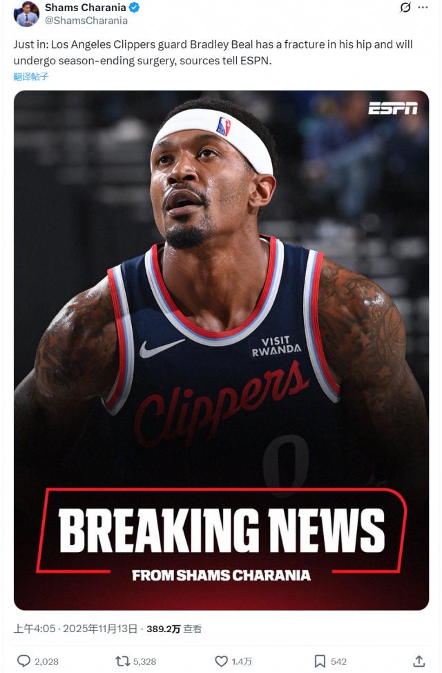 比尔需要6 - 9个月才能重返赛场。他与快船的合同是2年1100万美元,2026 - 27赛季有价值562万美元的球员选项。此次重伤后,比尔肯定会执行球员选项,下赛季继续留在快船。以他本赛季的表现,若试水自由市场,可能只能拿到底薪。