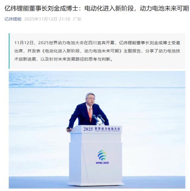 IT之家11月13日消息,据亿纬锂能公众号报道,11月12日,2025世界动力电池大会在四川宜宾开幕,亿纬锂能董事长刘金成博士受邀出席,并发表了题为《电动化进入新阶段,动力电池未来可期》的主题报告,分享了动力电池技术创新进展以及对未来发展路径的思考与判断。
