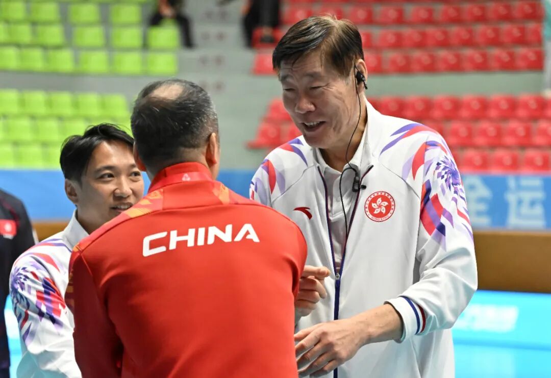 香港队教练陈刚(右)在比赛后与福建队教练滕茂民交流经验。