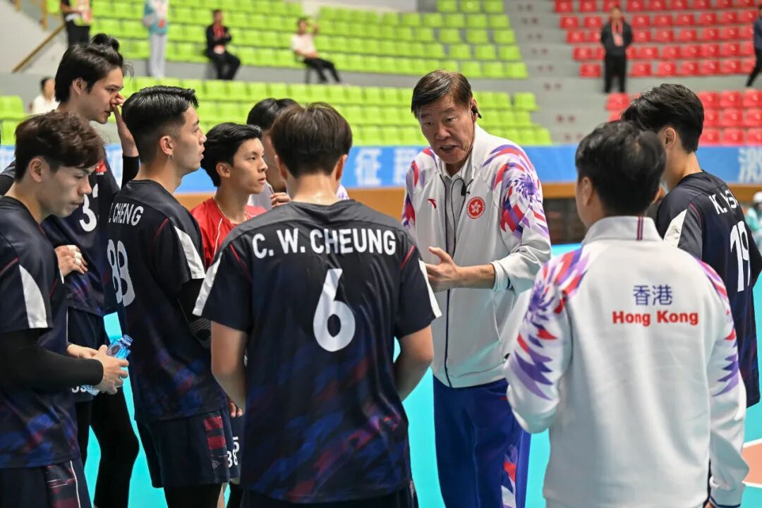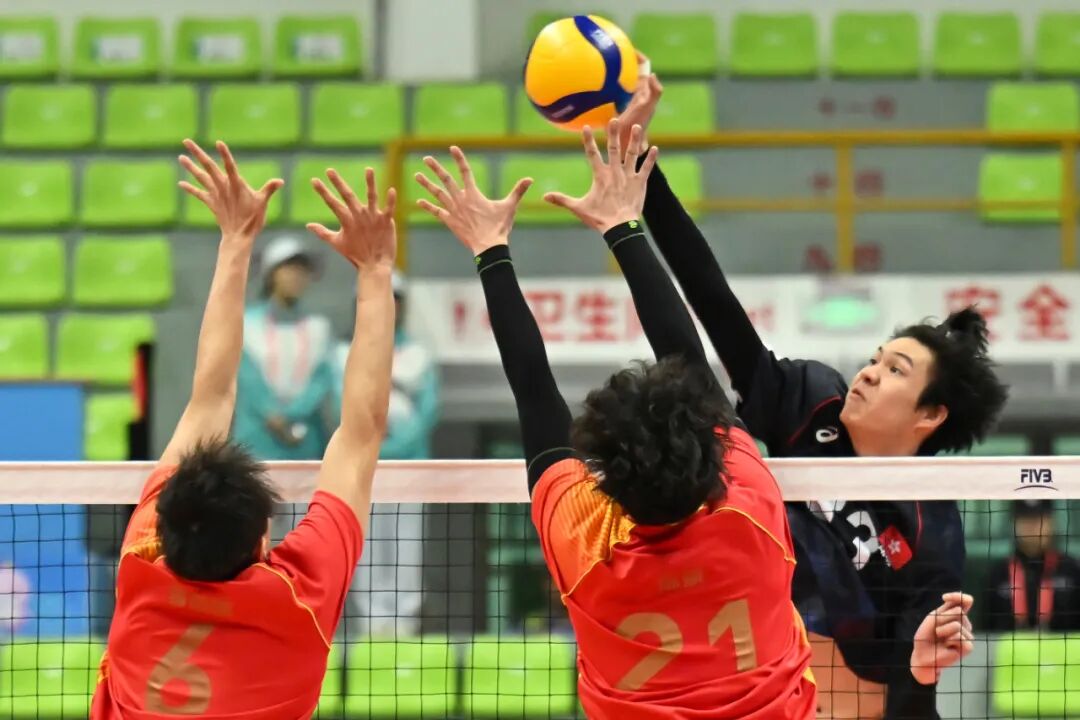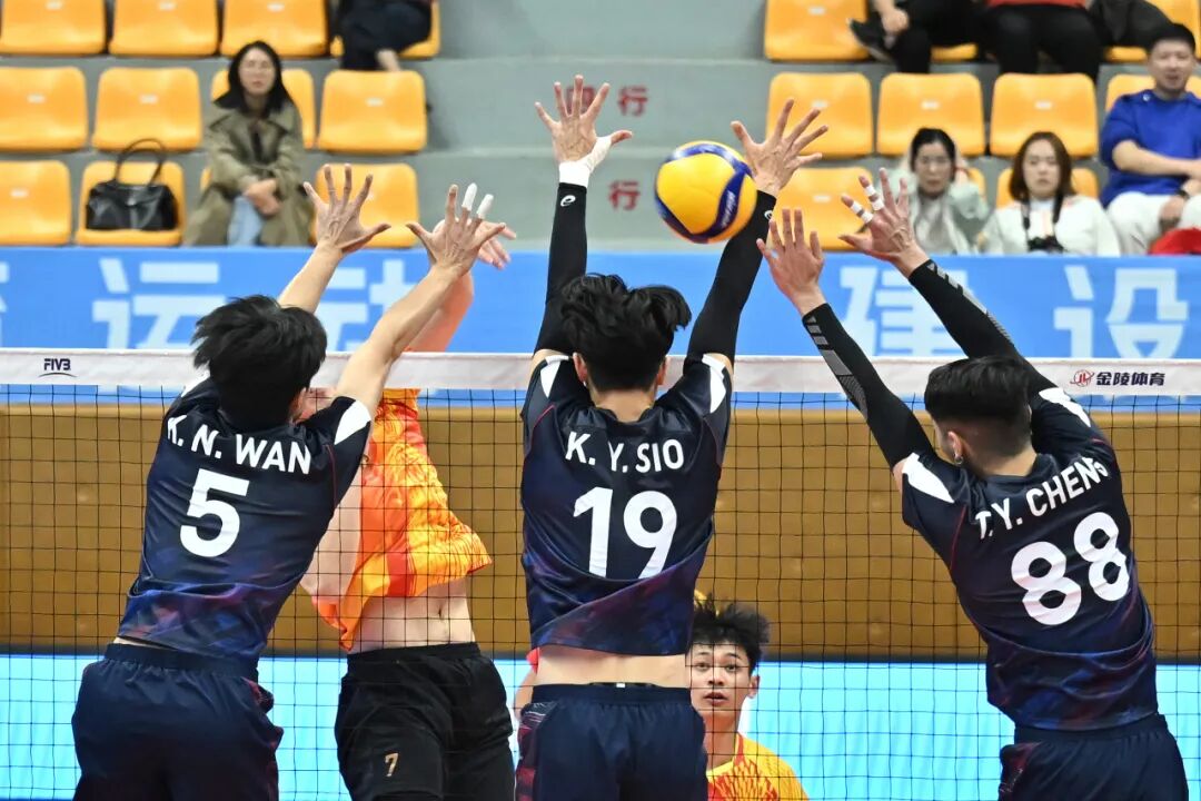 香港队球员温迦南(上左一)、萧加尧(上右二)、郑旨睿(上右一)在比赛中拦网。