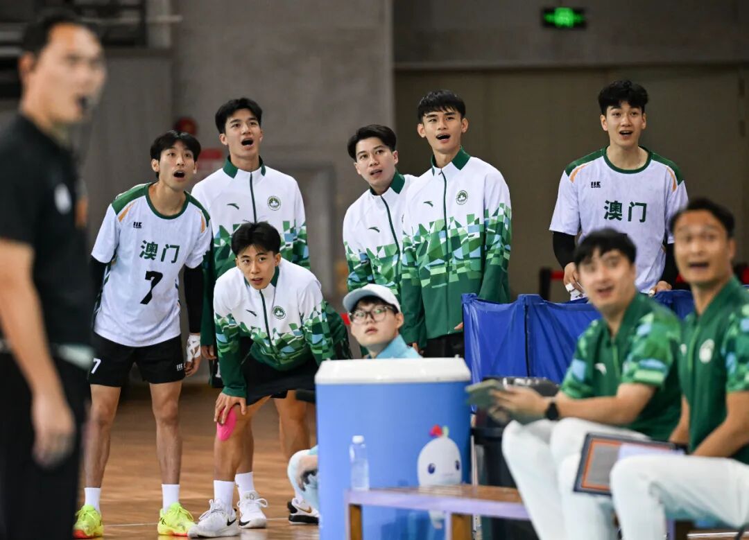 澳门队球员龚乐文(中)在比赛暂停间隙与队友交流战术。
