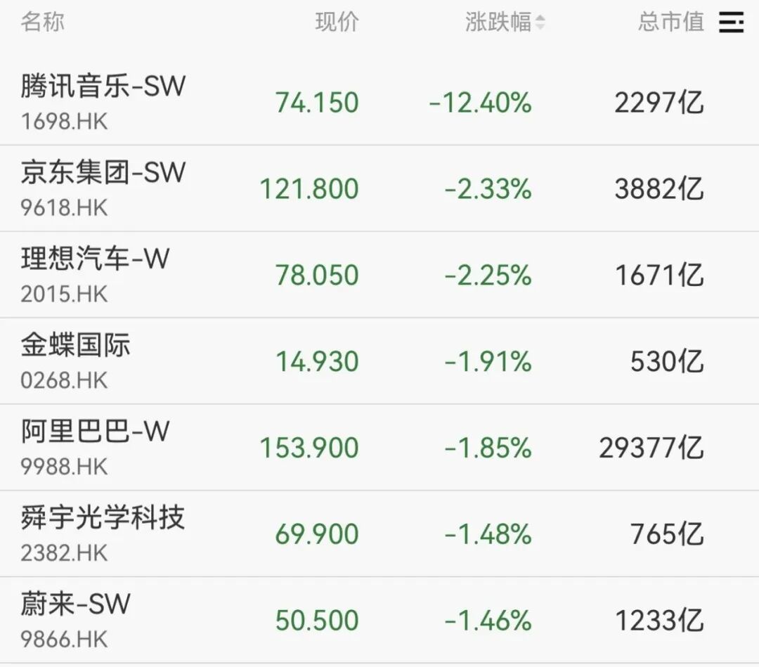 港股方面,三大指数震荡走低,腾讯音乐大跌超12%,京东集团、理想汽车、阿里巴巴等跟跌。