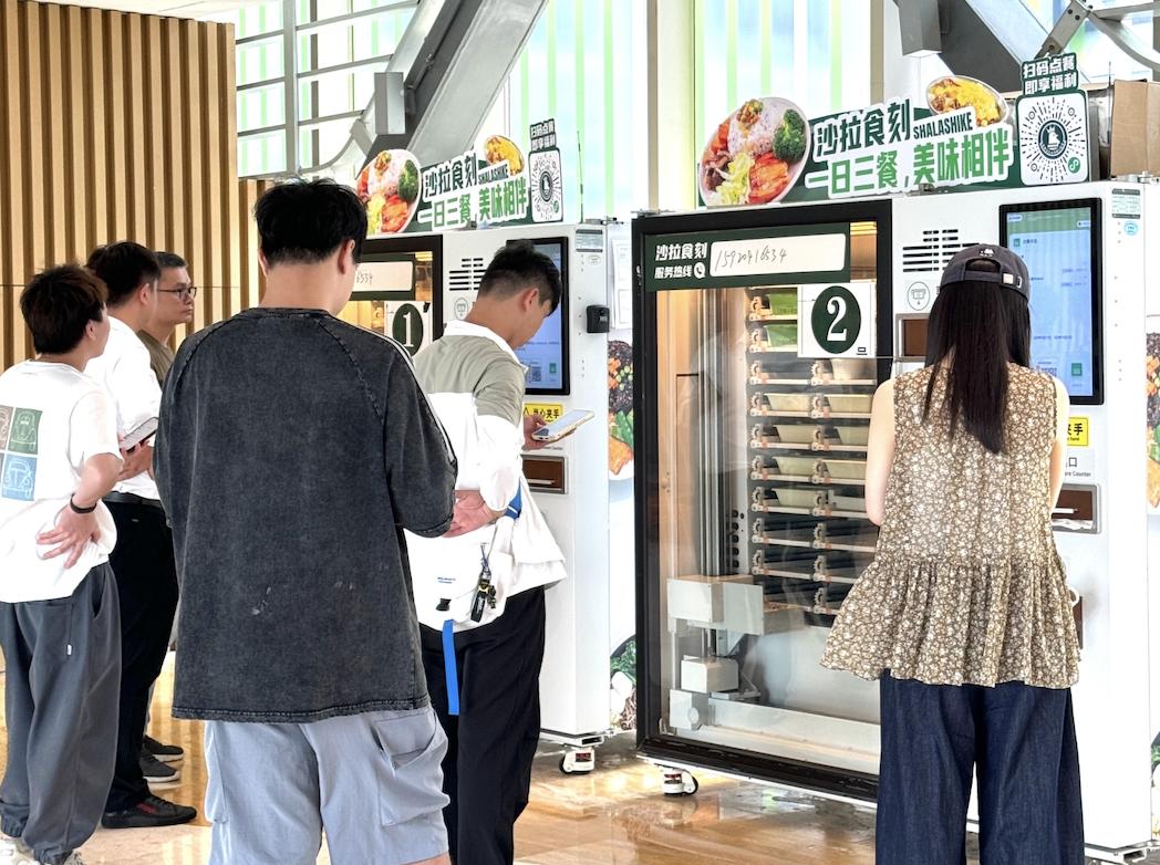 沙拉食刻的核心模式是在写字楼放置智能售餐机,这是一种典型的“空间占领”逻辑——试图通过物理设备的密集布局,来强行进入并占领白领的日常餐饮场景。