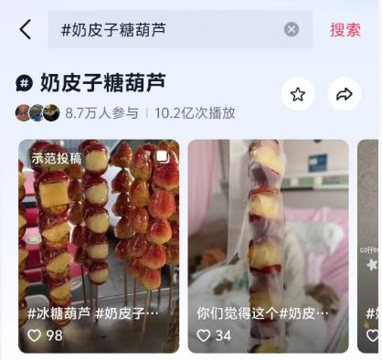 如今,随便打开一个app,都可能会推送奶皮子糖葫芦的相关内容。在抖音平台,#奶皮子糖葫芦#已获得10.2亿次播放,小红书相关话题也登上了站内热点榜。