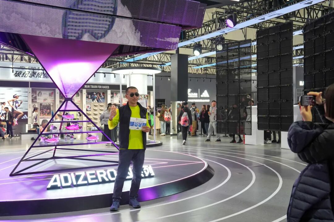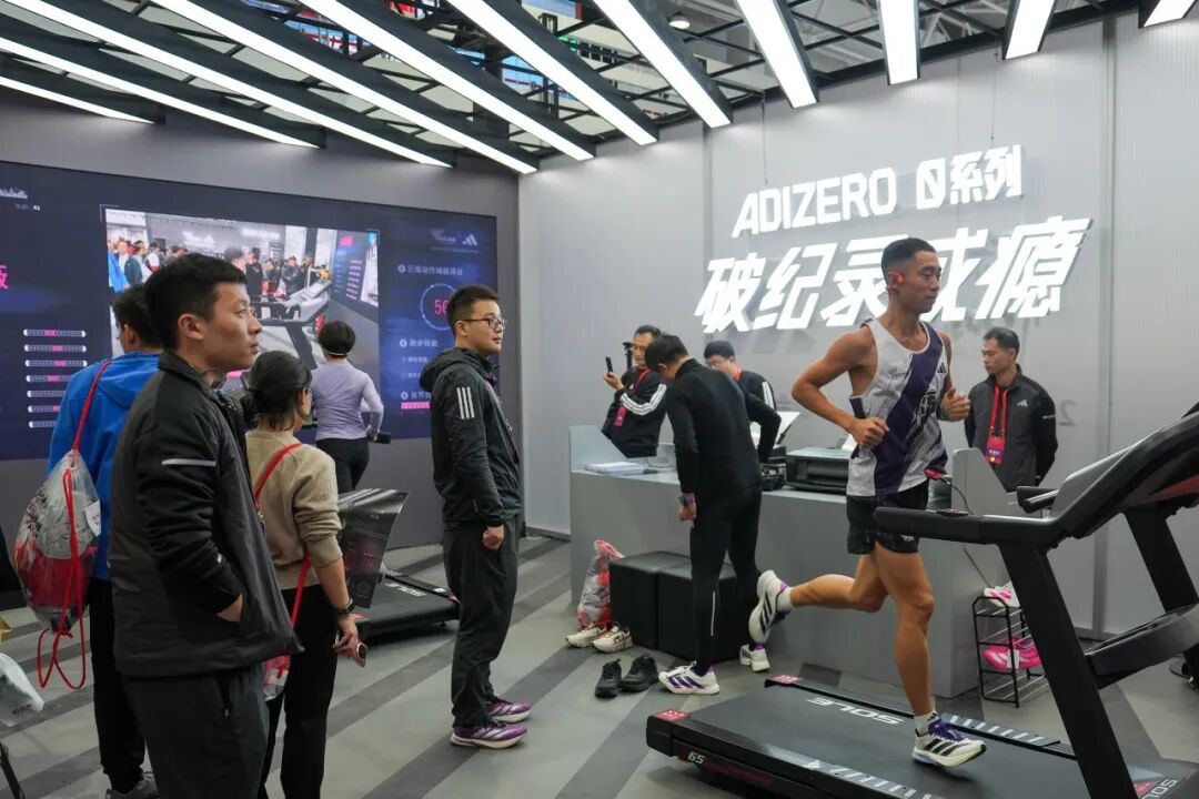 北马博览会现场,阿迪达斯打造“北马PB备战基地”,测量跑者动态跑姿,展示跑步家族产品。