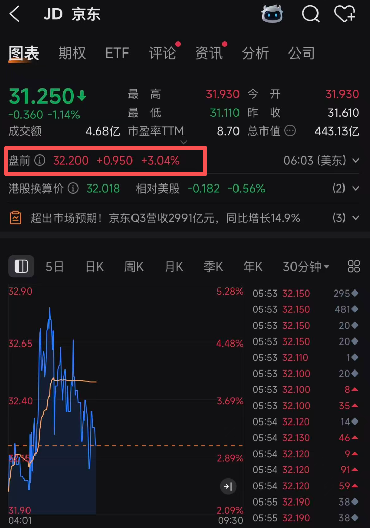 京东美股盘前大涨,三季报成绩超预期