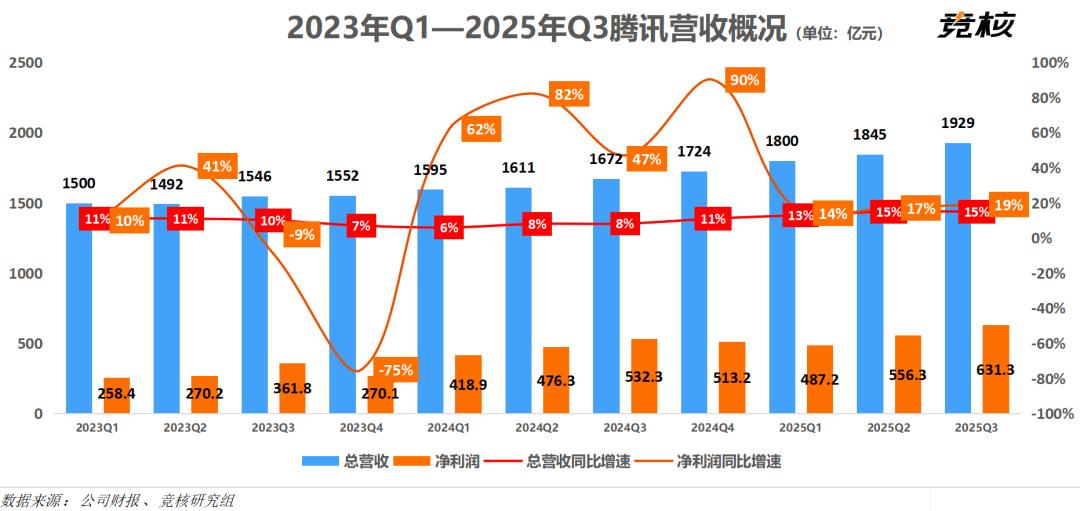 11月13日,腾讯公布2025年第三季度业绩报告。财报显示,Q3腾讯营收达1929亿元,同比增长15%。按国际财务报告准则,期内公司权益持有人应占盈利631亿,同比增长19%。腾讯在财报中称,这一稳健增长体现了游戏、营销服务、金融科技及企业服务等业务的良好态势。