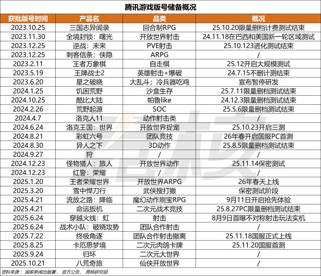 据竞核不完全统计,截至11月13日,腾讯游戏获批版号的新产品共27款。从游戏品类看,涵盖开放世界RPG、开放世界射击、开放世界捉宠、PVE射击、3D动作、团队竞技、PvEvP、二次元、自走棋等。