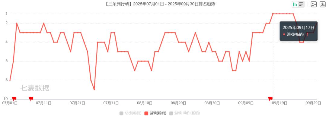 作为国产射击头部产品,《三角洲行动》已成为腾讯游戏业务的重要支柱。七麦数据显示,Q3期间游戏移动端在App Store游戏畅销榜排名始终在前10,多次登顶。此外,在PC端市场表现也日益强劲,今年8月登上顺网星研社网吧热力榜Top2。