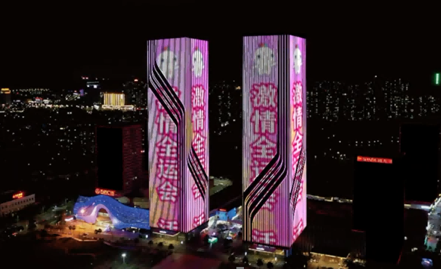 万达广场大楼外墙绚丽多彩的灯光与城市的夜色相互辉映