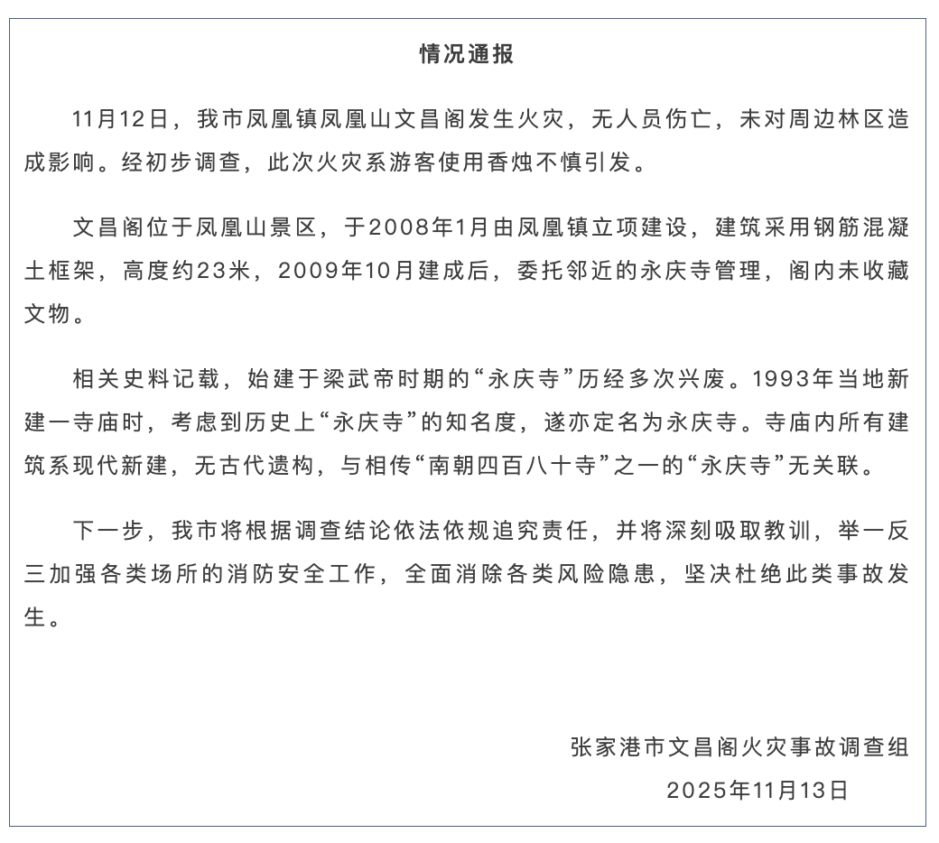 11月13日,江苏省苏州市张家港市文昌阁火灾事故调查组公布了情况通报。