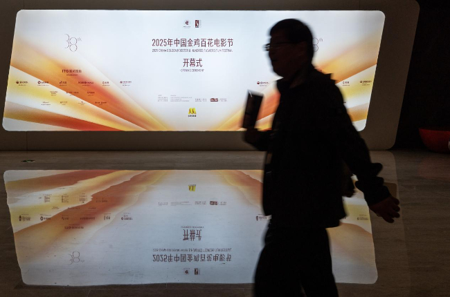 1月11日,2025中国金鸡百花电影节在福建省厦门市开幕。一名男子在闽南大戏院的电影节海报栏前经过。新华网记者 钟奕摄